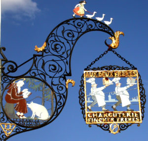 En observant attentivement la partie supérieure de cette enseigne vous y distinguerez la « Gaenselisel » ou « Lison aux oies », petite alsacienne promenant ses oies.