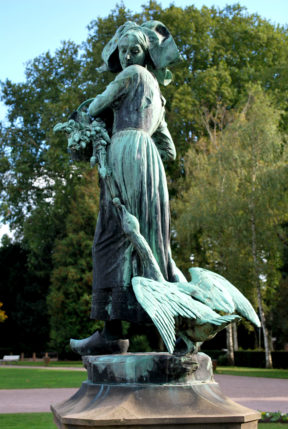 C’est ainsi que l’on plaça cette statue dans la Halle en 1899. Mais on constata très vite que l’emplacement était tellement sombre qu’on distinguait difficilement la statue. Voilà pourquoi l’année suivante on déplaça la « Ganzeliesel » dans les jardins de l’Orangerie où elle est toujours encore visible à gauche du Pavillon Joséphine.