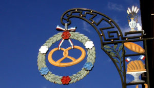 Pour peu que vous examiniez les façades de nombreuses maisons alsaciennes, vous ne manquerez pas de remarquer ce qui servait de symbole aux boulangers des siècles passés : la « bretzel ». Il s’agit d’une pâtisserie salée en forme de nœud ou de bras entrelacés.
