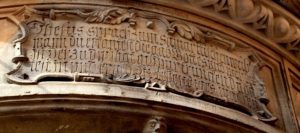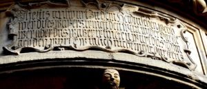 Voici ce qu’on peut lire sur le cartouche côté Nord « JHESUS aber sprach : Ich bin das Brott des lebens wer Zu mir kümbt der würt nicht hungern und wer an mich glaubt der würt nimmer mehr dürten ». Ce qui correspond à la citation de l’évangile de Jean 6 :35 qui déclare : « Jésus leur dit: Je suis le pain de vie. Celui qui vient vers moi n’aura jamais faim, et celui qui exerce la foi en moi n’aura jamais soif ».