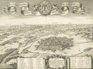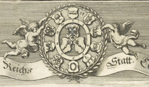 Une gravure de Merian réalisée en 1643 tirée de sa « Topographia Alsatiae » représente une vue de Colmar sur laquelle apparaissent deux angelots qui tiennent une pièce principale avec deux écus des armoires de Colmar (massue) surmontés d’un écu avec l’aigle impérial. Tout autour de cette pièce centrale figurent les armoiries des dix corporations évoquées précédemment.
