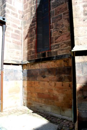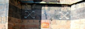 Faites le tour de l’édifice situé dans le bas de la commune, et arrêtez-vous près du choeur (côté tourné vers l’Est). Vous apercevrez sur le mur une longue bande noire avec de curieuse décorations. De quoi s’agit-il ?