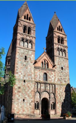 Elle fut érigée sur les ruines d’une église primitive édifiée par Hildegarde von Schlettstadt, une mécène allemande. A sa mort, en 1094, elle fut inhumée dans la crypte de l’église Sainte-Foy.