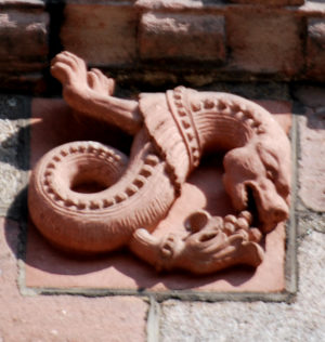 A n’en pas douter, cette figure fait référence à Satan et à l’idolâtrie, mais elle pourrait également évoquer la victoire de la foi sur l’idolâtrie, la posture du monstre indiquerait dans ce cas qu’il est vaincu.