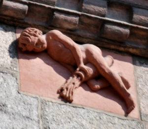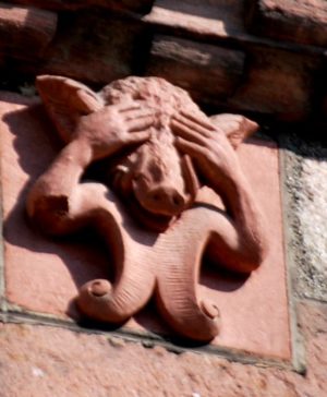 Nous trouvons également une tête de sanglier qui peut évoquer la lutte que doit mener l’homme pour maitriser ses vices et ses péchés. Le sanglier représente le danger immédiat qu’il faut combattre physiquement. Le fait qu’il cache ses yeux voudrait-il signifier qu’il ne veut pas voir le danger ?