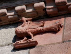 Il y a également un oiseau à longue queue, peut-être un paon qui en déployant ses plumes symboliserait l’orgueil. Mais selon la tradition chrétienne il pourrait aussi évoquer la roue solaire et dans ce cas être un signe d’immortalité, sa queue évoquant le ciel étoilé.
