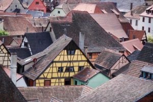 En Alsace, ce qui caractérise également les maisons, ce sont les toitures. Très souvent enchevêtrées avec d’autres toitures dont la pente peut varier entre 45° et 65°, elles sont recouvertes de tuiles plates dont l’extrémité est arrondie.