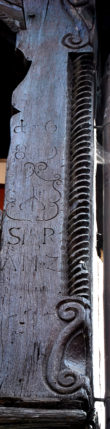 On peut aussi observer sur le poteau cornier une inscription dans un cartouche avec la date de construction, les initiales des propriétaires ainsi qu’un message visant à attirer la protection divine sur la maison et ses habitants.