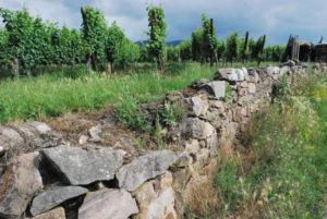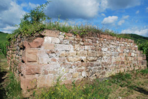 Si vous suivez ces rues vous déboucherez bien sûr dans les vignes environnantes. Et c’est justement au milieu des parcelles de vignes qu’il faut chercher la base carrée d’un donjon du XIIe siècle.