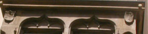 Pour cela il faut examiner l’oriel et notamment sa partie supérieure. De chaque côté de la fenêtre apparaissent encore deux niches (vides) mais surmontées de deux écussons.