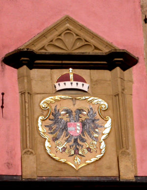 Sur la façade principale de l’édifice, figurent encore aujourd’hui les armoiries des Habsbourg.