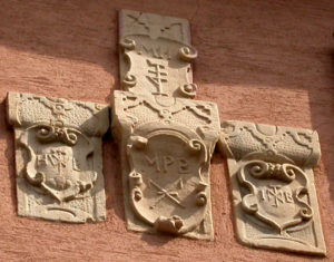Si d’aventure vous vous promenez un jour à Sélestat, vous y verrez probablement cet ensemble d’armoiries sur la façade d’une maison du centre ville.