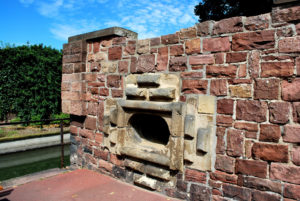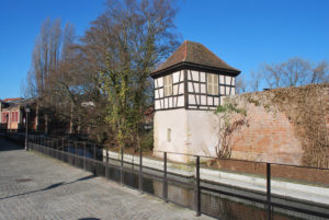 Cette grille, appelée « Grille des pêcheurs », se situait au niveau de cette petite tour incluse dans le mur d’enceinte (Fig. 129). On aperçoit également de ce coté-ci de la Lauch une imposante « bouche à feu », vestige du bastion de défense composé de plusieurs canons (Fig. 130). »