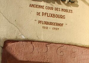 Au-dessus de la porte de droite, sur le linteau se trouve gravée dans la pierre rose une date, « 1568 » ainsi qu’une inscription « Ancienne cour des Nobles de Pflixbourg – Pflixburgerhof 1512-1757 ».