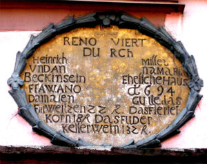 Voici le texte gravé à l’intérieur de ce cartouche ovale : « Reno Viert durch Heinrich Miller und Anamaria Beckin in sein ehelichehaus fiaw ano 1694 damal ein gulte das fitl weitzenz 22R. das viertel korn 18 R. das fuder kellerwein ist 132 R. ».