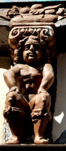 Notez aussi dans le triangle formé par le pignon de l’oriel, l’étrange peinture d’un homme portant barbe et capuche. Bizarre… En tous cas elle ne semble pas être d’origine.
