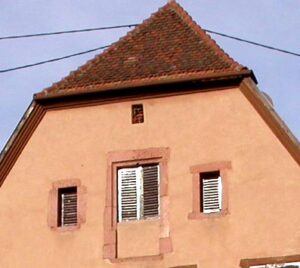 Sous le pignon de la halle, on aperçoit encore l’ouverture par laquelle les sacs de céréales étaient autrefois hissés au moyen d’une poulie.