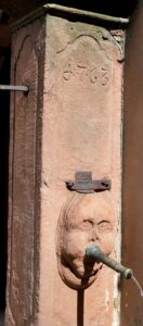 Sur un côté de la fontaine se dresse un pilier sculpté d’une tête grotesque tenant une goulotte dans sa bouche.