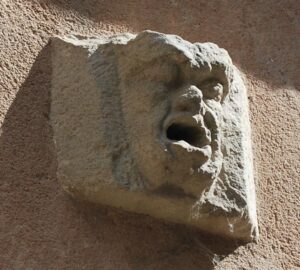 Dans cette rue on peut s’interroger sur la signification de cette tête de pierre qui surgit au-dessus de la porte du n°3.