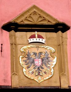 Sur ces armoiries on distingue au centre un écu composé de deux parties. Celle de gauche correspond au drapeau de l’Autriche, constituées d’une barre blanche et d’un écu rouge depuis 1230.