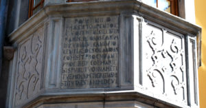 Sur cet oriel de trois étages de style Renaissance, on peut lire sur un cartouche le texte suivant :