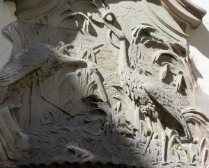 Et juste au-dessous apparaît une scène sculptée évoquant des marais dans lequels évoluent des cigognes.