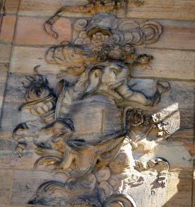 En passant devant le portail de l’entrée du « Palais de Rohan », arrêtez-vous devant le pilier de gauche pour examiner le trophée qui y apparaît.