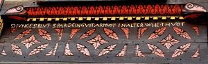 Sur l’appui d’une des fenêtres, du côté droit, entre deux têtes de singes, vous pourrez lire un texte mystérieux. Voici son contenu : « IVNGES BLUT SPAR DEIN GUOT ARMUOT IM ALTER WHE THUOT ».