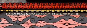 Sous la fenêtre de gauche apparaissent la signature de l’architecte et la date de construction : « Johannes Volrhat MDLXXXXIIII », c’est-à-dire « 1594 ».