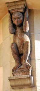 C’est sur cette maison orientée vers la place, que vous trouverez, sur la façade arrière, cette caryatide en bois sculpté représentant un singe assis soutenant l’édifice.