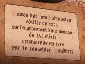 Comme je vous le disais, cette maison est située dans le plus petit des quartiers de Colmar. Mais il ne subsiste que trois des six maisons qui composaient cette circonscription fiscale au XIVe siècle dénomée « Zu den Saltzkasten » (Près des coffres à sel)