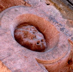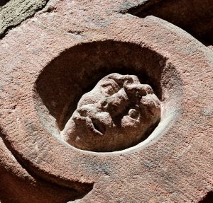 Parmi les coquilles et les fleurons qui le décorent, vous apercevrez deux petites têtes dans l’arc du portail. En y regardant de plus près, vous constaterez la souffrance qu’évoquent ces visages figés dans la pierre.