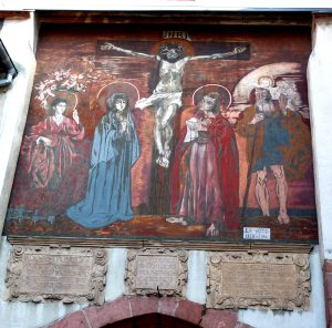 La façade Sud laisse apparaître une grande fresque murale datant de 1436 et représentant une crucifixion. On peut y identifier, à gauche la Vierge et Sainte Foy tandis qu’à droite apparaissent Saint Jean et Saint Christophe.