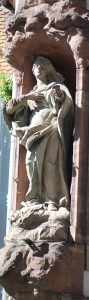 Autre détail qui distingue cette grande maison tout au bout de la rue des Veaux, c’est la statue abritée dans une niche de style rocaille. Elle est connue sous le nom de « Vierge au lys ».