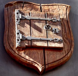 Je vous avais dit que le blason à identifier était défini en langage héraldique comme étant « D’argent à la porte à lamelles de bois de gueules chargée d’une serrure en dextre, d’un anneau en champ et de deux ferrures en senestre, le tout de sable »