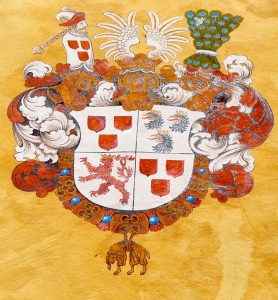 Il y a ensuite, un lion dressé portant une couronne et dont la queue est bifide ou double qui fait référence aux armoiries de la seigneurie de Guéroldseck qu’avait acquit Guillaume 1er en 1485.