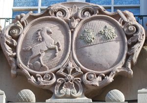 Un premier écu, celui de la famille Fels, à gauche comporte une licorne. Il s’agit d’une créature légendaire ayant la forme d’un cheval avec une seule corne droite et spiralée. En langage héraldique la licorne est considérée comme un symbole de pureté, de force, de courage et de pouvoir divin.