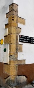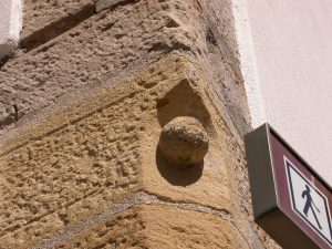 Cet élément décoratif appelé « bille » ou « balle » romane est encore visible sur une maison située à proximité de la place des Six montagnes noires.