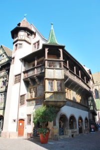 La peinture que je vous avait proposé d’identifier, il y a quelques jours, figure sur la façade Est de la maison Pfister à Colmar, et notamment sous la coursive du deuxième étage.