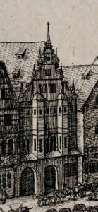 Si vous examinez attentivement cette gravure, vous y apercevrez la maison qu’avait acheté, en 1585, Léonhart Kaw, un riche marchand originaire de Belgique.